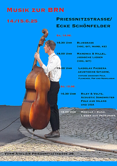 wie jedes Jahr gibt es zur (Nicht) BRN 14./15.6. vor meinem Atelier  - da wo die schönen Rosen blühen - am Dorfplatz Prießnitzstraße/Schönfelder  -  Musik.